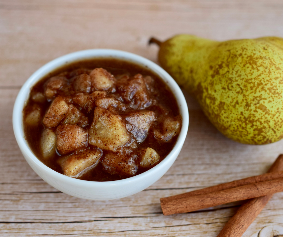 1. Lava, pela y trocea la pera en trozos más o menos pequeños según el acabado que desees.