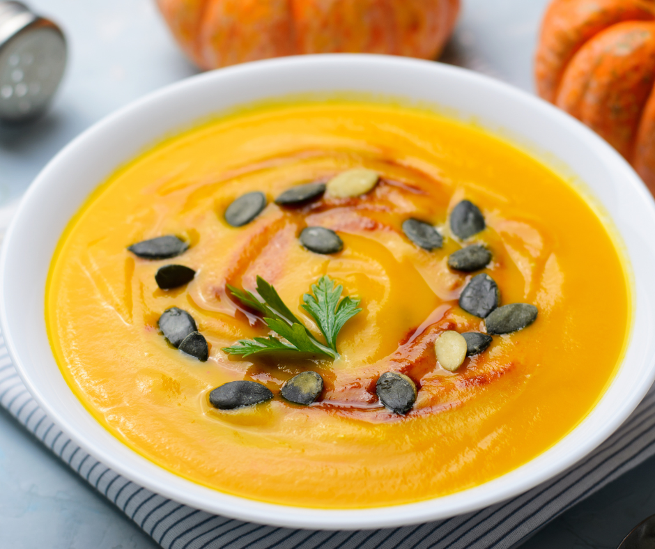 7. Sirve la crema en un bol y espolvorea con las semillas de sésamo y calabaza.